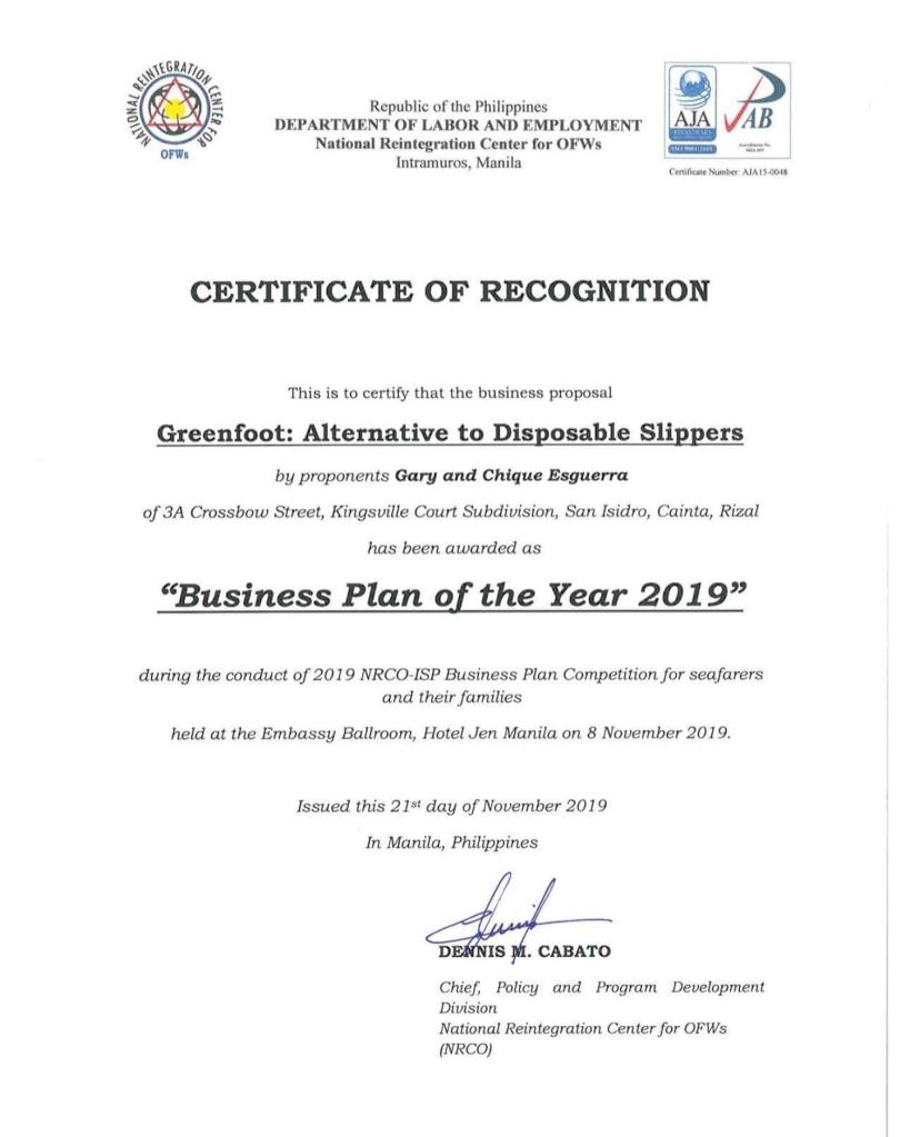 GreenFoot: Alternative to Disposable Slippers” is the NRCO-ISP Business Plan of the Year 2019